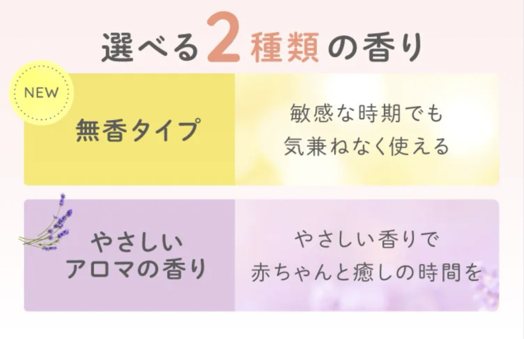 アロベビー ミルクローションは、“やさしいアロマの香り”タイプ(精油由来)と、“無香”タイプが選べます。