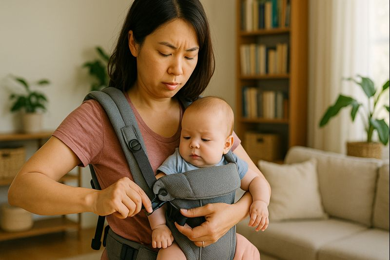 - 赤ちゃんの顔が常に見えるように、抱っこ紐の高さとフィット感を調節します。
