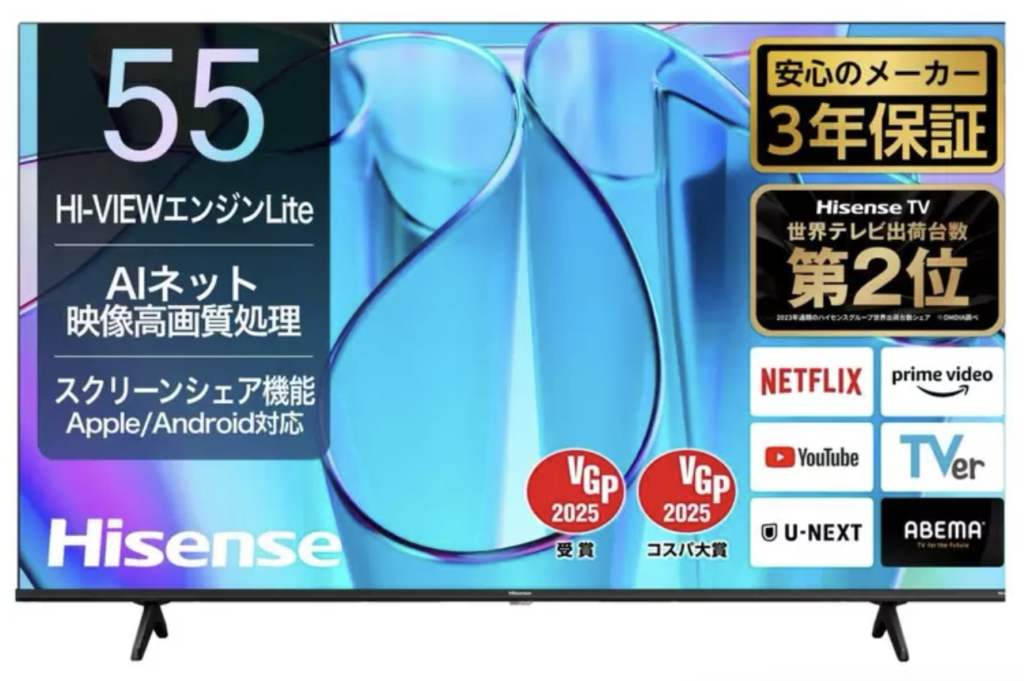 - 近年は中国メーカーハイセンスのテレビも扱いが増えており、メーカー保証3年付きの高コスパ製品として注目されています。