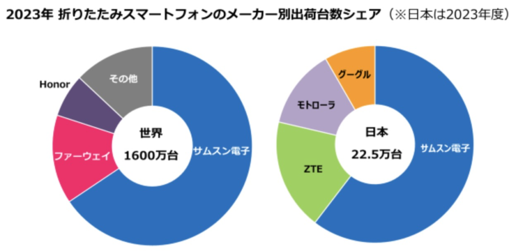 調査会社のデータによると、2023年の世界折りたたみスマホ出荷台数は約1,600万台に達し、スマートフォン全体の1.4%を占めました。
