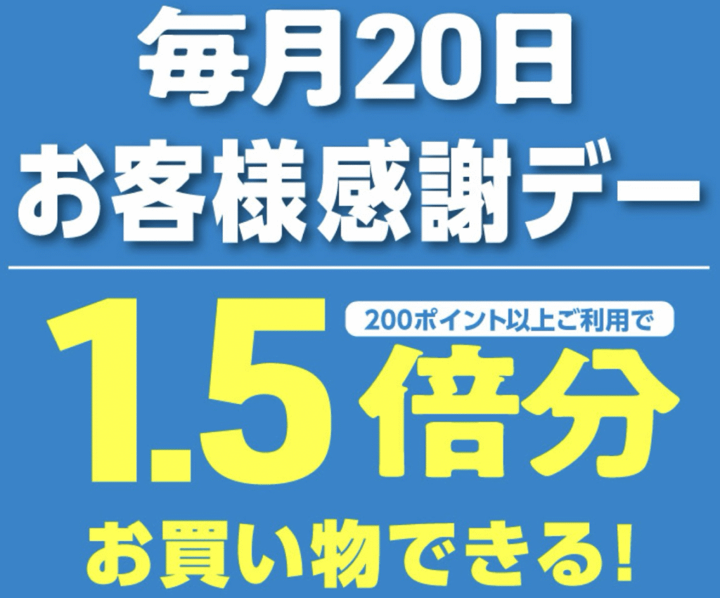 通常の1ポイント=1円というレートを、20日限定で1.5円に引き上げることで、ポイント利用額に対して33.3%の割引、またはポイントの利用価値が1.5倍になるという圧倒的な優位性が生まれます。