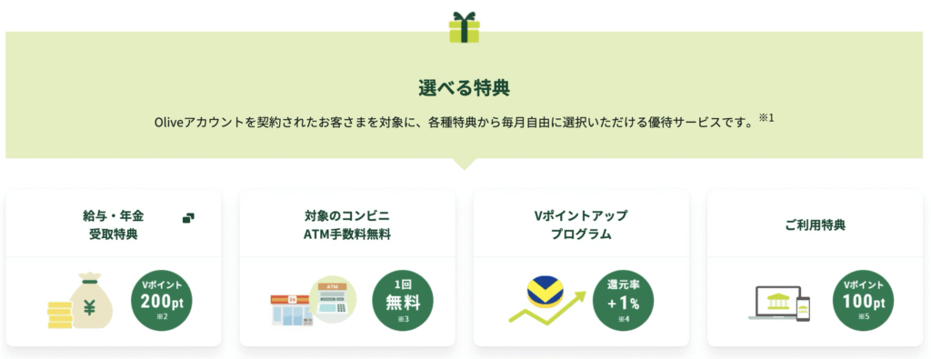 定額自動送金サービスを有効活用すると考えると、まずは給与振込先口座を三井住友 Oliveアカウントに設定するのが基本となってきますが、このOliveアカウントを契約し、4つの選べる特典の中から「給与・年金受取特典」を選択することで、給与を受け取るだけで、毎月200円分のVポイントがもらえてしまうすごくお得な特典も行われているわけです。