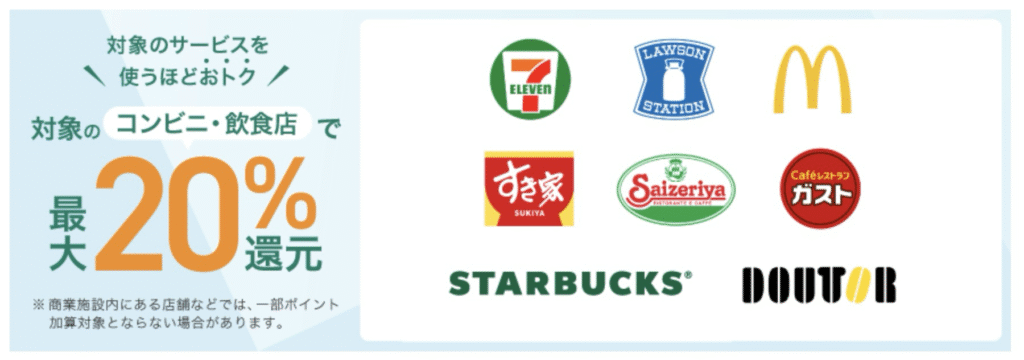 対象のコンビニ・飲食店は現実的に利用できる店舗が多く、セブンイレブンやローソンといった大手コンビニや、マクドナルドやサイゼリヤ、すかいらーくグループ、ドトールコーヒーなど幅広いラインナップとなっています。