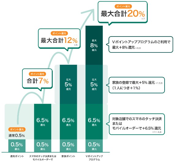 これだけでも十分にお得なのに、「Vポイントアッププログラム」というサービスがあり、三井住友Olive フレキシブルペイのクレジットカード機能として利用した場合、通常時のポイント還元率は0.5%と少し物足りないですが、この「Vポイントアッププログラム」を最大限利用すると、なんと最大20%までポイント還元率を上げることができます。
