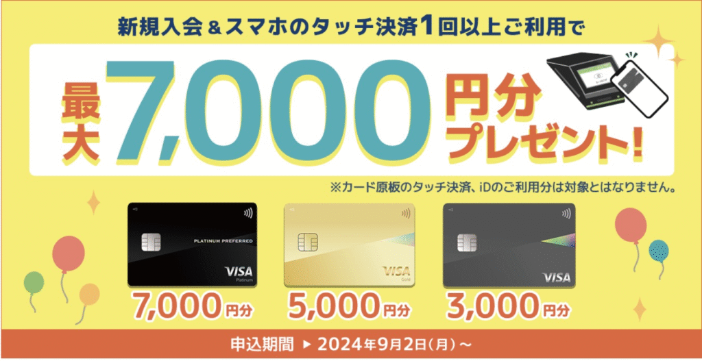 特にお得なのが “対象のコンビニ・飲食店で、スマホのVisaのタッチ決済・Mastercardコンタクトレスで支払うと、利用金額200円(税込)につき7%ポイント還元” という衝撃の還元率を叩き出せる点です。