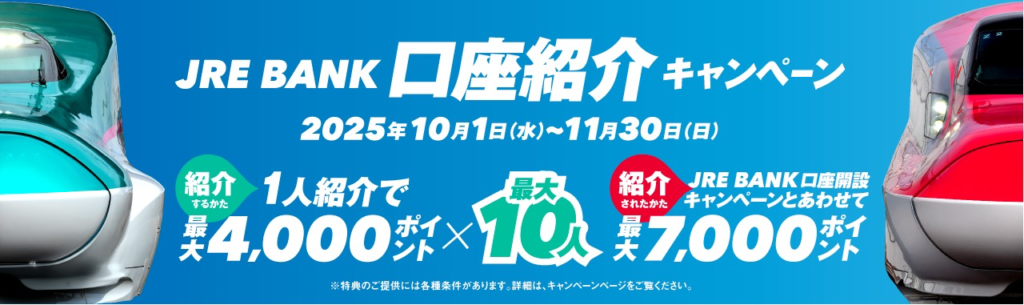 また、JRE POINTが最大6,000P貰えるJRE BANK口座開設キャンペーンも開催されていますので、ポイント獲得に向けてこちらも積極的に活用していきましょう!