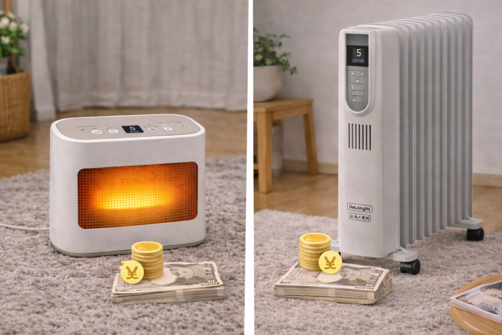 冬の寒さ対策に人気の遠赤外線ヒーター「シロカのかるポカ」と、高級ヒーターの代名詞「デロンギのオイルヒーター」。