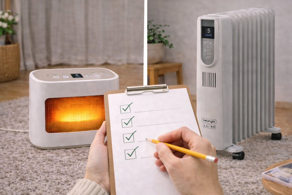 例えば「電気代は多少かさんでも、エアコンの乾燥から解放されたい」という人ならデロンギを選んで後悔は少ないでしょうし、「とにかく予算内で静かなヒーターが欲しい」という人にはかるポカがベストでしょう。