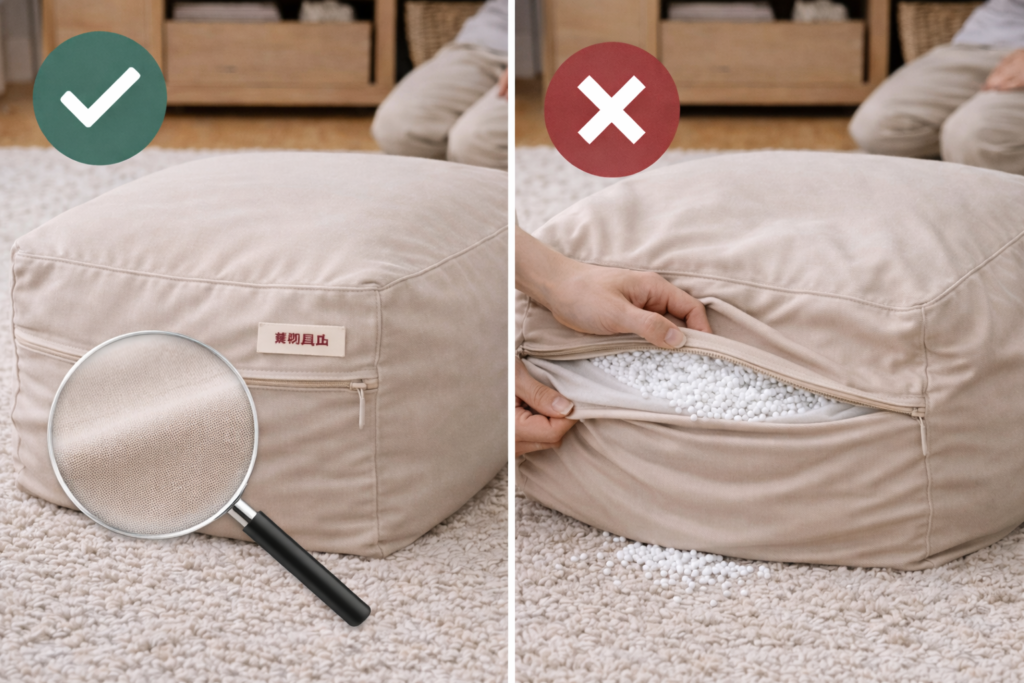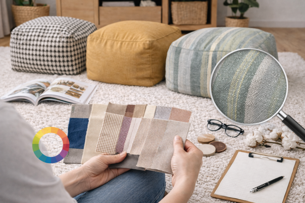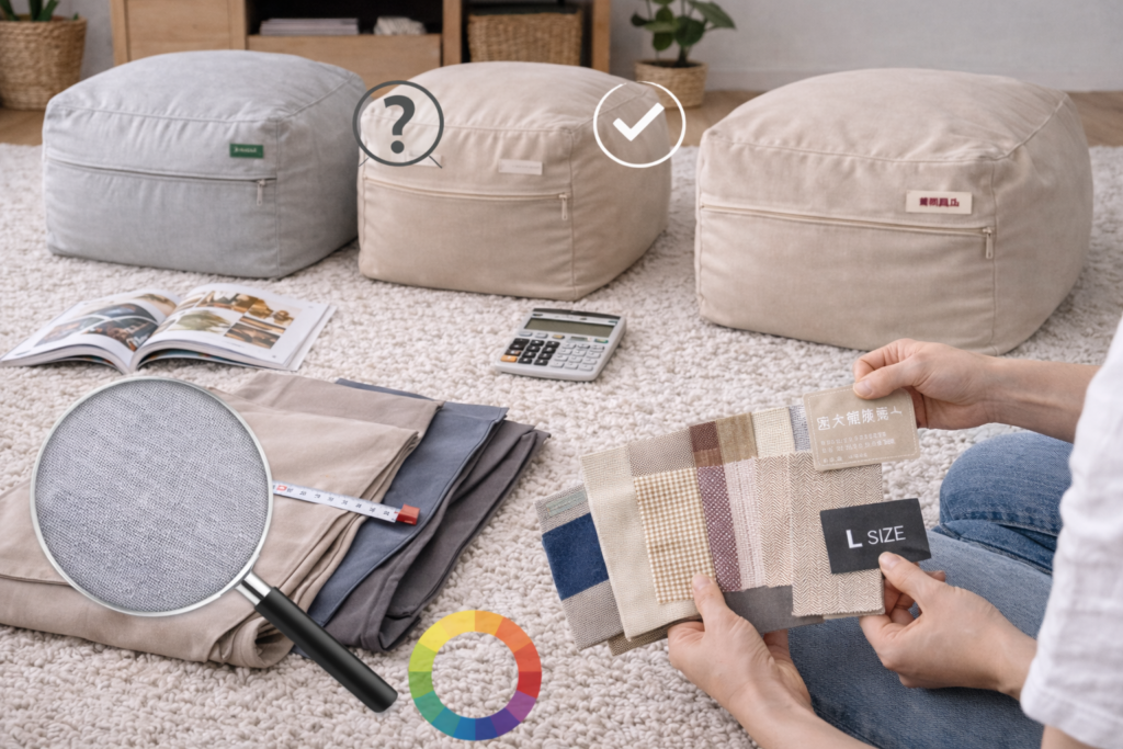 デザイン面の現実解としては、「無地〜バイカラー(2面が分かる)」は座り方の誘導にもなるので、ビーズクッションの構造と相性が良いです。