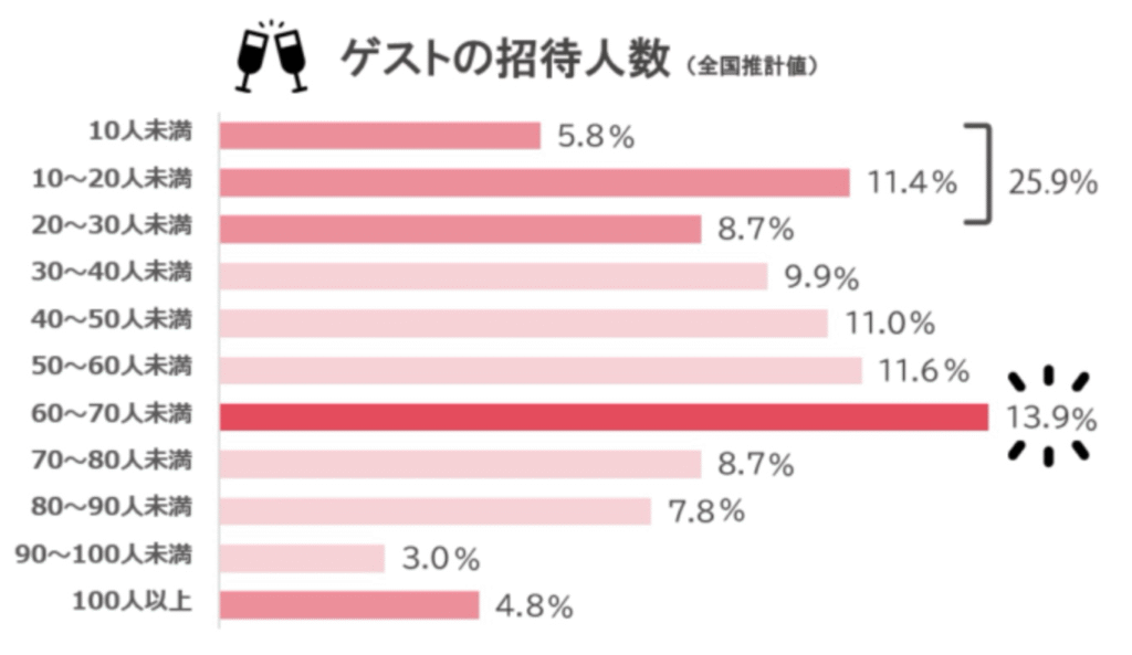 結婚情報誌などの最新の調査データ(全国平均)を見ると、挙式・披露宴の招待客平均人数は「50名〜70名台」がボリュームゾーンになりつつあります。